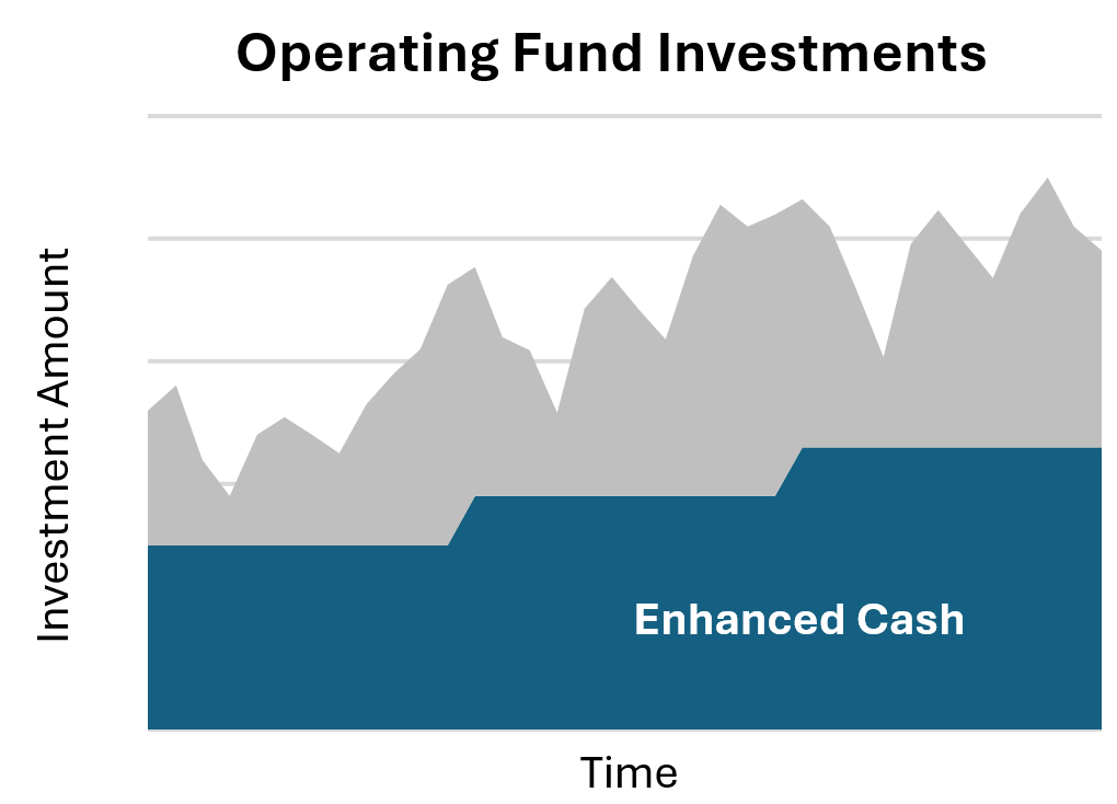 The Enhanced Cash Fund has a target duration of 1 year and seeks to deliver greater return than the Daily Liquidity Fund. The fund invests in a diversified mix of high-quality bonds and can serve as a core investment for operating funds with few liquidity requirements. It is rated AAAf by S&P Global Ratings.